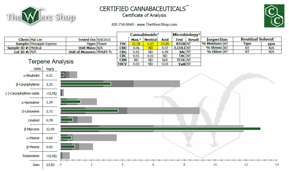 I had a chance to get the Pineapple Express analyzed for cannabinoids and terpenes by our friends at the Werc Shop. Click here to see the actual PDF.