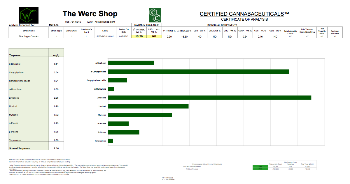 I sent a sample of the Blue Sugar Cookies strain to get analyzed by the Werc Shop analytical lab in Bellevue Washington. Click here for the PDF of the results.