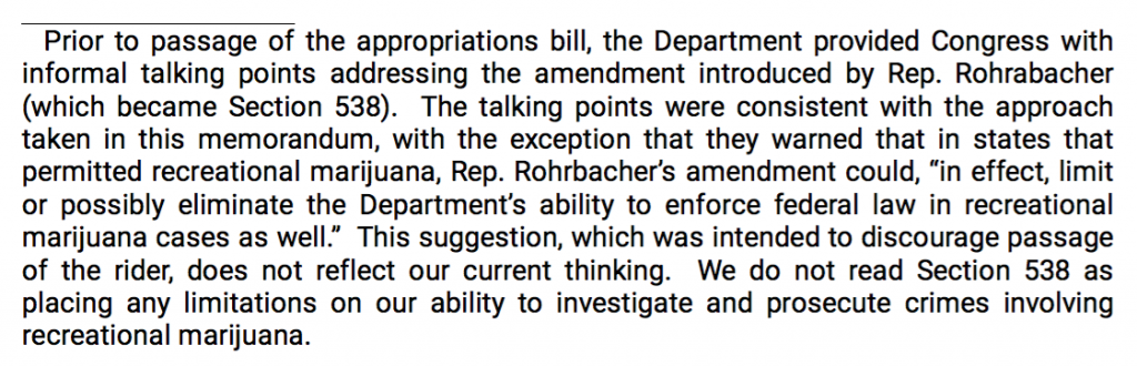 The congressman’s spokesman said his office has not yet heard back on the request for an investigation, but expects that the department will revise its view of the law in line with its sponsor’s interpretation. However Patrick Rodenbush, a Justice Department spokesman, disagrees. He told Marijuana.com in a statement that “Consistent with the Department’s stated enforcement priorities, we don’t expect that the amendment will impact our ability to prosecute private individuals or private entities who are violating the Controlled Substances Act,”