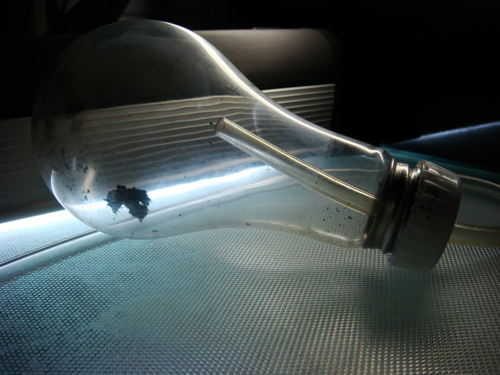 1.) Hold light bulb in left hand away from you, while it’s in a paper bag. Grip the neck of the bulb with the bag around it. Be sure the bulb’s tip is out of the bag. (Dark brown/black glass, silver circle in center.)