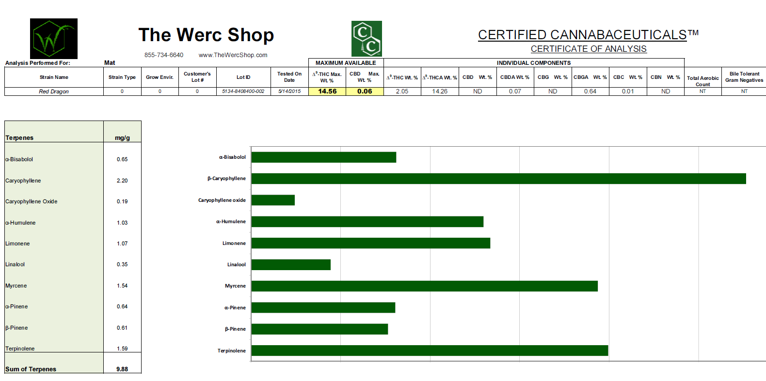 Terpene information can be found all over the net. Personally, i dig this informational post about terpenes on Icmag, and that’s where I’m getting a lot of this information from if you were curious. For the sake of this review I’m only commenting on the information on the terpenes showing up over 1 mg per g. All Terpenes are listed as mg / g: