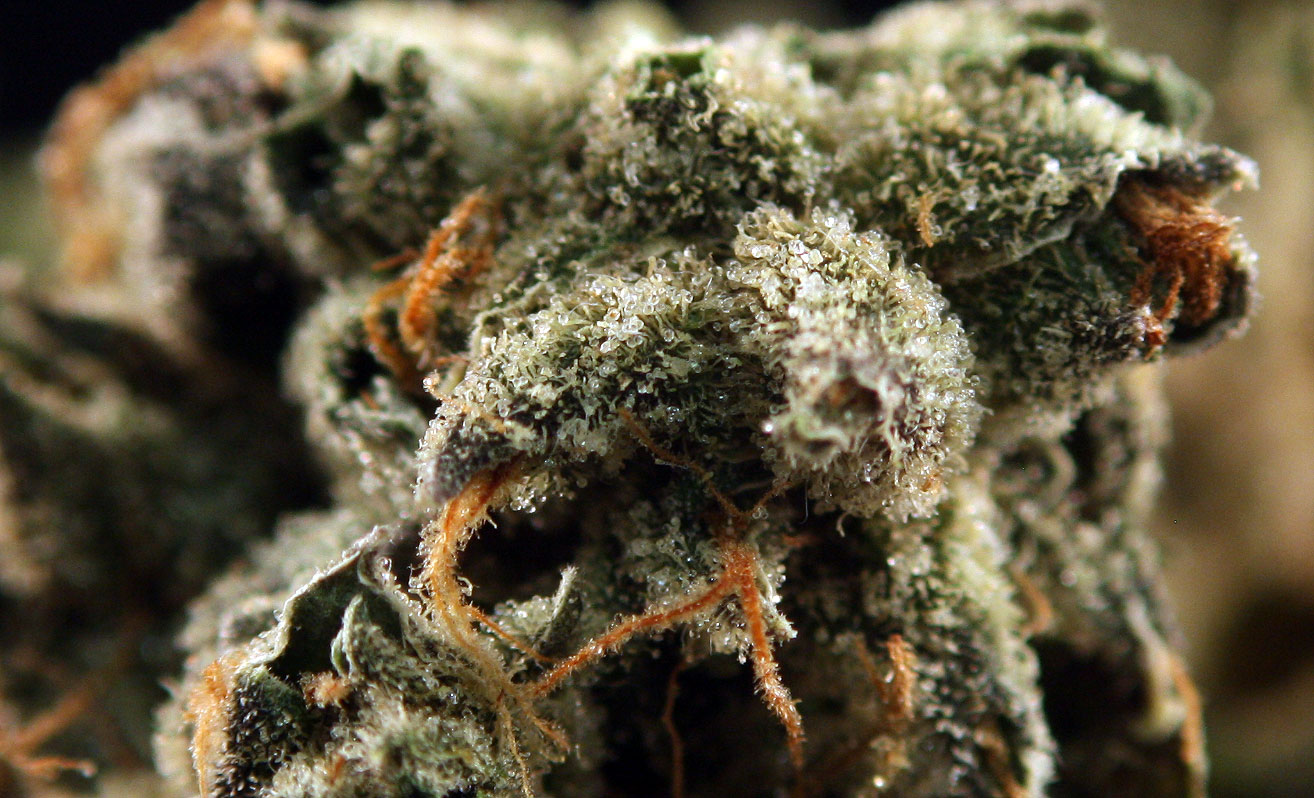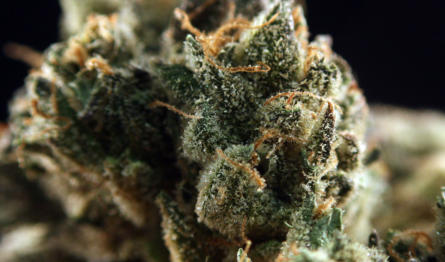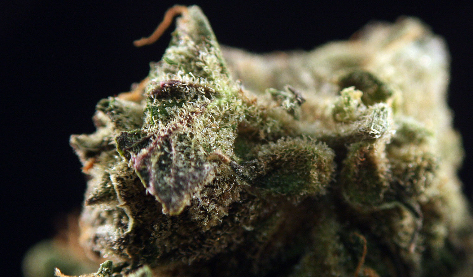 This sample of Strawberry Cough was dense and borderline dry, but when you go to break it apart, it’s almost spongy. Densely good stuff, covered in trichomes with a nice dark calyx and dark brown pistils. Definitely some nice bag appeal, or jar appeal or whatever people call it these days.